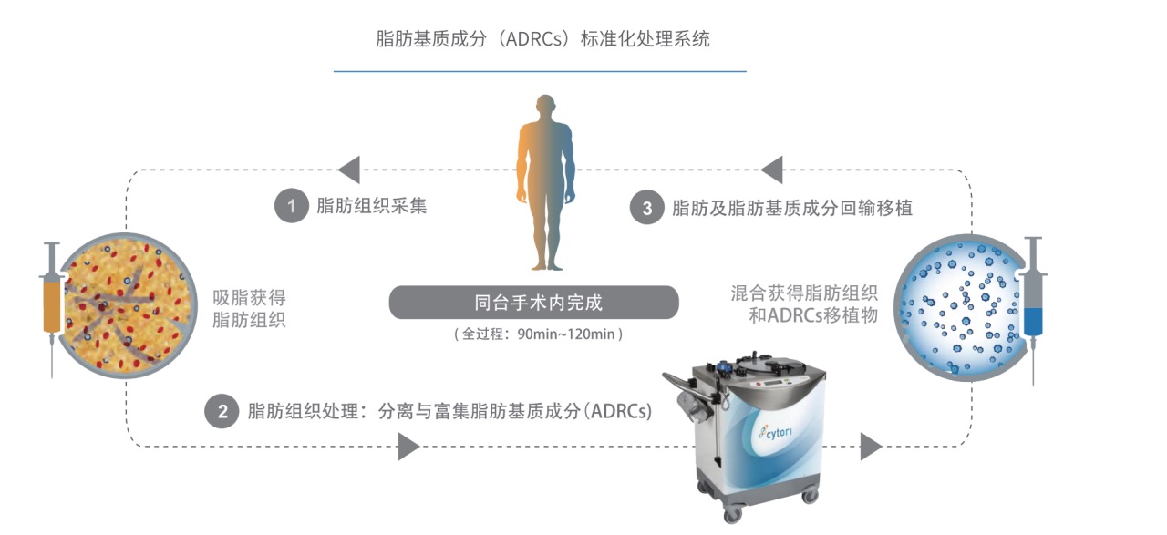Celution®疗法避免将ADRCs运送到手术室外处理流程,通过简单操作可以在手术室现场收集并移植ADRCs,大幅缩短操作时间。