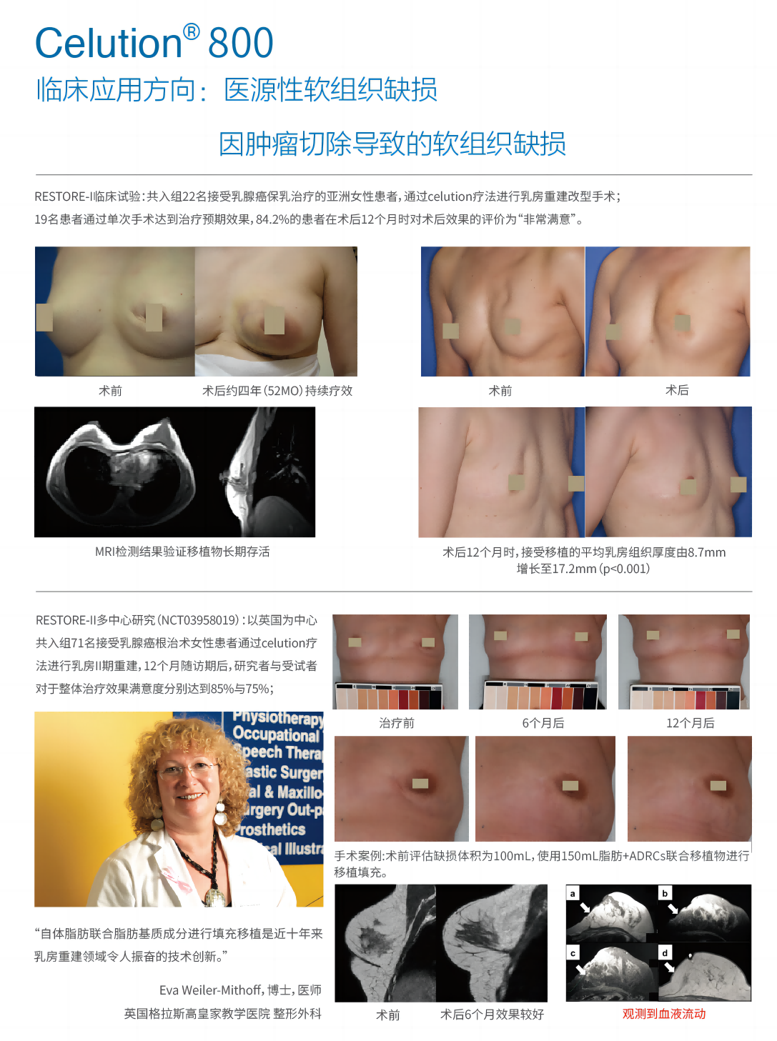 由于Celution 800设备可从成人患者脂肪组织中处理和富集ADRCs,使用这些脂肪基质成分与自体脂肪的混合物进行治疗可以避免人造移植物带来的排异和感染问题,帮助临床医生更好地解决传统移植物所不能解决的重大临床问题。